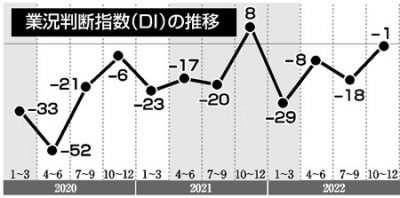 2023/01/11経済一般年末商戦や旅行支援効果 みやぎん経済研究所と県は、12月期(昨年10~12月)の県内企業動向アンケートを実施し、企業の景況感を示す業況判断指数(DI)が、全体で前期(7~9月)比17ポイント改善のマイナス1だったことを明らかにした。...
