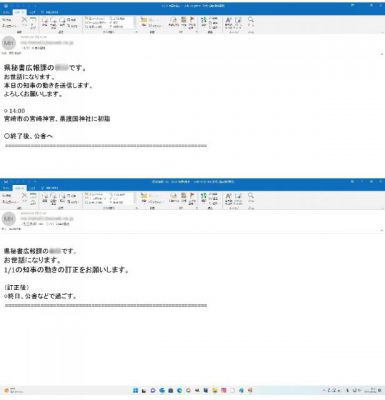 2023/01/05県内一般ニュース河野知事の新型コロナウイルス感染を巡り、県が本紙掲載の「知事の動き」1月1日分について行動履歴を変更するよう依頼した。県は当初、「宮崎市の宮崎神宮、県護国神社に初詣」と記載したメールを送っていたが、陽性判明後、秘書広報課職員が「終日、公舎...