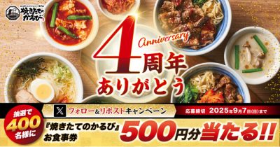 【焼きたてのかるび】4周年記念!抽選で400名様にアプリクーポンが当たるXキャンペーンを開催