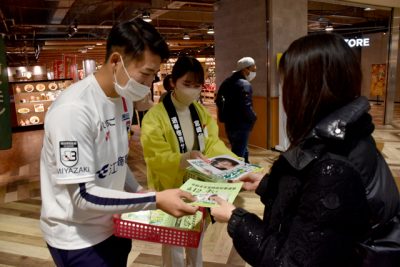2022/12/18トピックnews知事選(25日投開票)の投票率向上を目指し、宮崎市選管は18日、同市の商業施設で啓発活動を行った。宮崎公立大の選挙啓発部「ライツ」とサッカーJリーグ3部(J3)・テゲバジャーロ宮崎、同市明るい選挙推進協議会が参加し、買い物客に投票を呼びか...