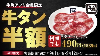 【牛角】“牛タンの日”に大盤振る舞い!9/1~12平日は「牛タン塩」半額、9/10限定で「上タン塩」1円!