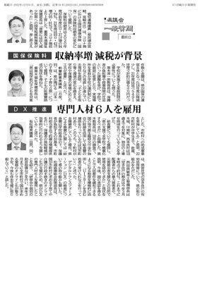 2022/12/01紙面から/最終日/国保保険料/収納率増 減税が背景/DX推進/専門人材6人を雇用 岩切達哉議員(県民連合宮崎、宮崎市区)は、コロナ禍における国民健康保険(国保)の保険料収納率の変化について質問した。 保険料収納率は2020年度が前年度比...