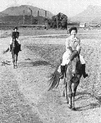 2022/11/28懐かしシリーズ馬上で歩を進める女性。延岡市・旭化成旭陽会馬術部(当時)のメンバーで、現在のグラウンド付近で楽しんでいた。部員らは九州大会などにも出場した。...
