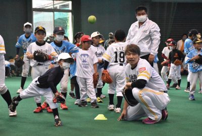武田投手と基礎を練習 ホークス選手、小学生に野球指導