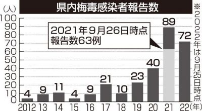 2022/10/02県内一般ニュース主に性行為により感染する「梅毒」の今年の宮崎県内感染者が72人(9月25日時点)となり、統計を取り始めた1999年以降で過去最多となった2021年同時期の63人を上回っていることが、県感染症対策課などのまとめで分かった。21年の合計89人...