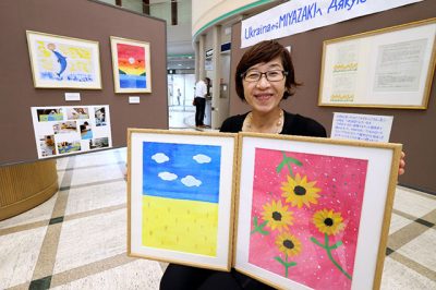 2022/09/16県内一般ニュース日本に訪れたウクライナ避難民に絵の具を寄付している宮崎市の絵画教室「現代っ子センター」(藤野ア子主宰)の元に、絵の具を受け取った子どもたちからお礼の絵が送られてきた。青空の下広がる小麦畑やウクライナ国花のヒマワリなどの作品9点は、同市・宮...