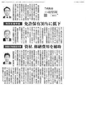 2022/09/14紙面から/最終日/特別支援学級/免許保有36%に低下/漁業の物価高対策/資材、修繕費用を補助 岩切達哉議員(県民連合宮崎、宮崎市区)は、県内小中学校の特別支援学級や、教室不足が指摘される特別支援学校の状況について質問した。 黒木淳一郎教...