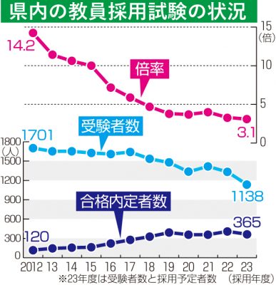 2022/09/09社会news本県公立学校の教員採用試験の倍率低下に歯止めがかからない。2023年度採用は過去最低の3・1倍(1次試験)で、12年度(14・2倍)の4分の1以下の低下。県教委は「教育の質の低下につながりかねない」と危機感を募らせ、なり手確保に力を注ぐ。...