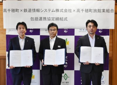 2022/08/30地域の話題高千穂町と町旅館業組合、JRグループのシステム会社「鉄道情報システム」(東京)は26日、包括連携協定を締結した。3者が協力し、デジタル技術を活用した高千穂観光の振興を目指す。 複数の宿泊予約サイトの情報を一元管理する同社のシステム...