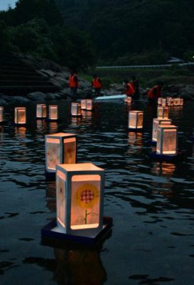 ウクライナに平和を 水面にヒマワリ灯籠 日向