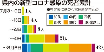 2022/08/08社会news新型コロナウイルスの感染が急拡大する中、県内で感染者の死亡者が増加している。多くは高齢者だが、基礎疾患を有する50代なども含まれる。重症化のリスクが高い高齢者施設でのクラスター(感染者集団)も増加傾向にあり、専門家は「一人一人が危機意識を...