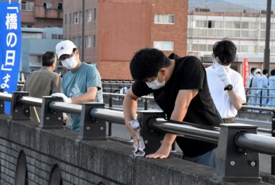 2022/08/04地域の話題8月4日の「橋の日」に合わせ、「延岡橋の日実行委員会」(塩月隆久委員長)は同日、延岡市の安賀多橋周辺で催しを行った。市民ら約350人が周辺の清掃や法要などを通じ、自然への感謝の気持ちを新たにした。 同日は午前6時前から橋や歩道を清...