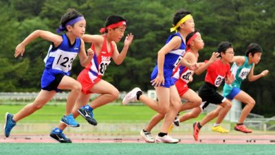 陸上100メートル6年岩下、菊地V 県スポ少中央大会