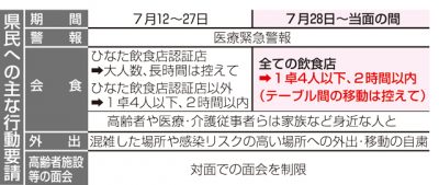 2022/07/27社会news県は27日、県内で新型コロナウイルスの感染拡大が続いている現状を踏まえ、コロナ対策を講じた「ひなた飲食店認証店」を含む全ての飲食店での会食について、「1卓4人以下、2時間以内」の制限を県民に対して要請すると発表した。同日、県庁で会見した河...