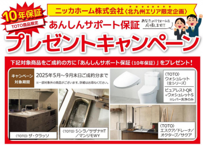2025/08/25サンプルニッカホーム株式会社【北九州エリア限定】水廻り製品をご成約いただいたお客様を対象に、通常よりも安心してお使いいただける「10年サポート保証」をプレゼントするキャンペーンを開催しています。 あんしん保証プレゼントキャンペーン ニッカホーム株...