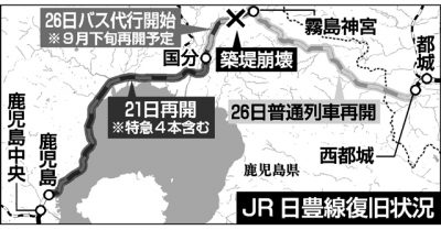2025/08/26社会news九州南部の大雨の影響で運休が続いていたJR九州の日豊線西都城―霧島神宮が26日、普通列車の運行を再開した。線路の土台部分の築堤(盛り土)が崩壊した霧島神宮―国分でも同日、バスによる代替輸送が始まった。 同社によると、霧島神宮駅で列...