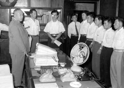 2022/07/12懐かしシリーズ県内の独身青年10人を移民として、ブラジル・サンパウロ州へ送り出した壮行会。戦後初めてで、県庁知事室で二見甚郷知事(当時)がはなむけに新品の作業服を贈り、お祝いの言葉を述べた。その後、家族や友人らに見送られ、神戸港からアメリカ丸で渡航した...