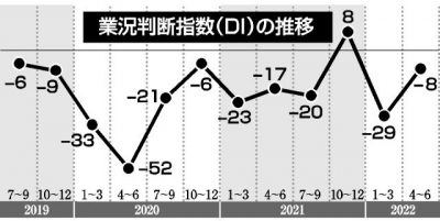 2022/07/05経済一般みやぎん経済研究所と県は4日、6月期(4~6月)の県内企業動向アンケート結果を発表し、企業の景況感を示す業況判断指数(DI)が、全体で前期(1~3月)比21ポイント改善のマイナス8だったことを明らかにした。県内景気の判断は「悪い」が43%...
