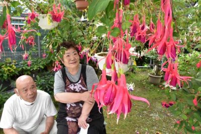 2022/06/28地域の話題えびの市上江の宮城秀昭(76)、絹代(74)さん夫婦の自宅庭で、南米などが原産地の花「フクシア」が咲き誇っている。下向きに咲き、美しく上品な見た目から「貴婦人のイヤリング」とも呼ばれる花が、訪れた人々を魅了している。 名古屋市に住...