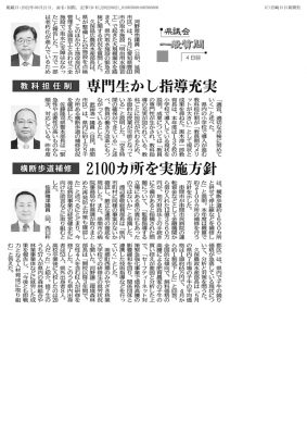 2022/06/21紙面から/4日目/教科担任制/専門生かし指導充実/横断歩道補修/2100カ所を実施方針 河野哲也議員(公明、延岡市区)は、5月に愛知県豊田市の取水施設「明治用水頭首工(とうしゅこう)」で起きた大規模漏水を踏まえ、県内取水施設の緊急点検に関す...