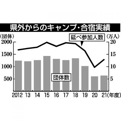 2022/06/08県内一般ニュース2021年度に県外から受け入れたスポーツキャンプ・合宿の団体数は634団体、延べ参加人数は12万8578人と、いずれも過去10年間で2番目に少なかったことが7日、県のまとめで分かった。新型コロナウイルス感染拡大の影響で、過去10年間で最低...