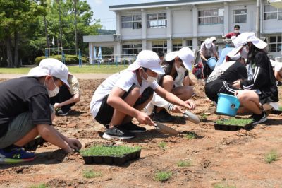 安全できれいなグラウンドに 都農小児童らが芝の苗植栽