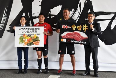 ラグビー日本代表に県産品贈呈 河野知事と清山市長