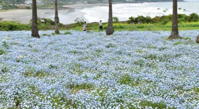 海に映える淡いブルー 日向でネモフィラ見ごろ