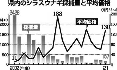 ウナギ稚魚県内不漁 21年度157キロ、前年比63キロ減