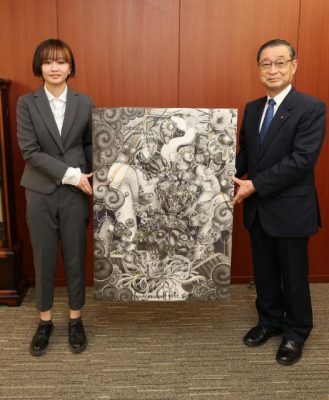2022/03/29県内一般ニュース「みやざき総合美術展」に関連し、将来有望な県内作家の芸術活動をサポートする「県芸術家支援プログラム」(宮崎日日新聞社主催、県など後援)に選ばれていた内田瑠那さん(18)=小林市野尻町=は28日、協賛企業の宮崎太陽銀行を訪れ、作品1点を寄贈...