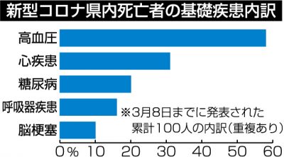 2022/03/21社会news新型コロナウイルスに感染し、死亡した県内感染者の約6割に高血圧、約3割に心疾患、約2割に糖尿病の基礎疾患があったことが、県のまとめで分かった。ほとんどが高齢者で、基礎疾患が複数ある人も多かった。県内では新規感染者数が3桁の状態が続くなど感...