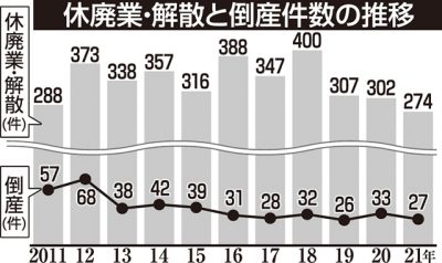 2022/02/18経済一般2021年に県内で休廃業・解散した企業は274件で前年比9・2%減となったことが、東京商工リサーチ宮崎支店の調査で分かった。倒産件数も18・1%減の27件と前年割れ。実質無利子・無担保融資やその後の返済猶予、各種補助金の支給など新型コロナ...
