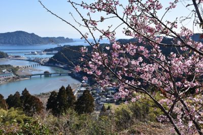 南郷城跡の河津桜見頃 太平洋一望、「海幸山幸」コラボ
