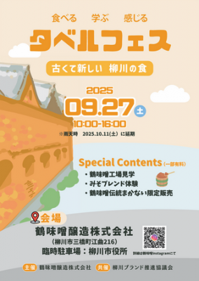 2025/08/22サンプル鶴味噌醸造株式会社柳川市の食を五感で楽しむ「タベルフェス」初開催! 鶴味噌醸造株式会社(本社:福岡県柳川市、代表取締役:吉開元治)は、2025年9月27日(土)に味噌の魅力を軸に「柳川の食と発酵文化」を体験できるイベント「タベルフェス」を...