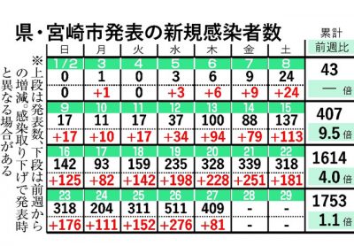 2022/01/28県内一般ニュース県と宮崎市は27日、新たに10歳未満~90代の409人の新型コロナウイルス感染を確認したと発表した。このうち同市は211人と2日連続で200人を超え、新たなクラスター(感染者集団)が医療機関などで4件確認された。同市は「誰が感染しているの...
