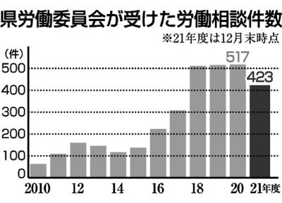 2022/01/28県内一般ニュース県労働委員会が2021年度に受け付けた職場のトラブルに関する労働相談は423件(2021年12月末時点)で、過去最多ペースで推移していることが同委員会のまとめで分かった。新型コロナウイルス関連の相談は22件にとどまるが、同委員会は「コロナ...