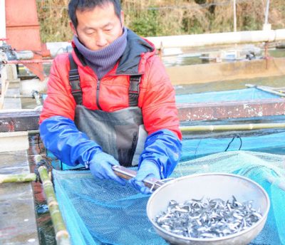 2022/01/15地域の話題日向市幸脇の養殖業者「あゆの是則」(是則由員社長)で、人工ふ化させた稚アユの出荷がピークを迎えている。13日は早朝から従業員らが、養殖池で6~7センチに育った稚アユを網ですくって輸送車に運び込む作業に追われていた。 同社では門川湾...