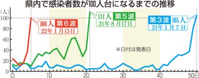 2022/01/13社会news新型コロナウイルスの県内の1日当たり新規感染者が13日、流行の第6波で初めて3桁台となった。感染確認が2桁台に突入した今月8日の24人から、わずか5日後に約4倍となり、2桁台になってから100人台までの到達スピードは第3波の10倍、第5波...