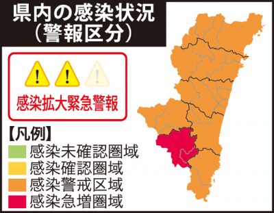 2022/01/13夕刊プラス1県内で新型コロナウイルスの新規感染者100人が確認され、入院者数が30人となったことを受け、河野知事は13日午後、県庁で会見を開き、県全域に感染拡大緊急警報発令を発表した。これに伴い、都城・北諸県圏域を県独自の感染区分で最も深刻な「感染急...