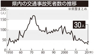 2022/01/06県内一般ニュース県内で2021年に発生した交通事故の死者は30人で、全国共通の統計が残る1948(昭和23)年以降では、同年の22人に次いで2番目に少なかったことが5日、県警のまとめで分かった。新型コロナウイルス感染拡大による外出自粛が影響したとみられる...