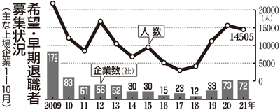 2021/12/29経済一般上場企業が今年1月から10月末までに早期・希望退職者を募集した人数は1万4505人と、3年連続で1万人を超えたことが、東京商工リサーチの調査で分かった。赤字企業が6割を占めたが、黒字企業による大規模な募集もみられた。業績悪化を理由にした小...