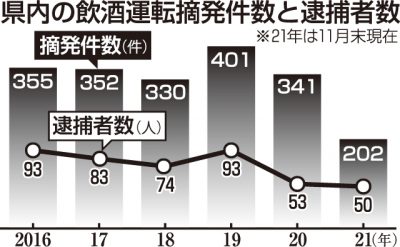 2021/12/26トピックnews県内の飲酒運転による年間摘発件数が、11月末現在、過去5年で最少ペースとなっている。県警は新型コロナの影響で飲食店などでの飲酒機会が減ったことが理由とみているが、事故を起こすなどして逮捕されるドライバーは50人と昨年同期比で3人増加。親類...