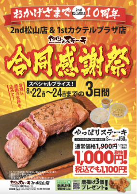【やっぱりステーキ】2nd 松山店がオープンから10周年!日頃のご愛顧に感謝の気持ちをこめて1st カクテルプラザ店と合同でお得な感謝祭を開催!