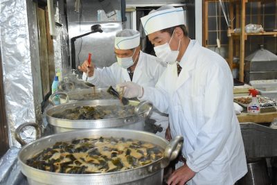2021/12/07トピックnewsおせち料理や歳暮用の甘露煮や昆布巻きの仕込みがピークを迎えている。三股町長田のしゃくなげの森では7日、社長の池辺美紀よしのりさん(52)が自社で養殖した名物の尺ヤマメの甘露煮の調理に追われていた。 調理場には大鍋3~5個が並び、池...