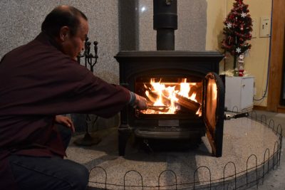 来客迎える暖炉の炎 えびの市・白鳥温泉上湯