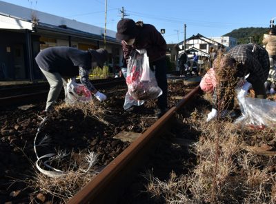 JR日南線 全線再開向け駅構内美しく 住民ら草刈りに汗