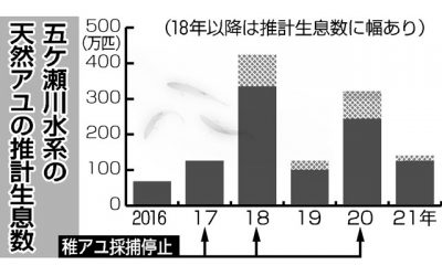 2021/12/03県内一般ニュース全国有数の天然アユの産地・五ケ瀬川水系で、天然アユの今年の推計生息数が、大幅に回復した2020年(243万~321万匹)から一転、約半分の126万~141万匹にとどまったことが県の調査で分かった。前年の推計生息数を基に県が停止するか判断す...