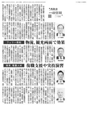 2021/12/02紙面から/2日目/フェリー新船/物流、観光両面で効果/保育、看護人材/復職支援や実技演習 山下博三議員(自民、都城市区)は東京都・県東京ビルの再整備事業を巡って、建て替えに向け公募している事業者に「県産材の積極的な活用を求められないか」と聞...