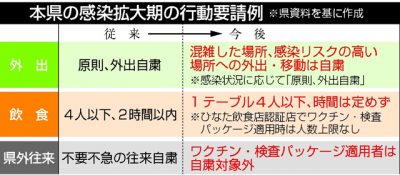 2021/11/26県内一般ニュース県は25日、新型コロナウイルスの感染再拡大期の行動要請について、現行の対応を緩和し、一律の外出自粛は求めない方針を決定した。国が感染対策の基本的対処方針を見直したことを受けた措置。一方、不要不急の往来自粛要請の対象地域は、国が「まん延防止...
