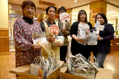新聞エコバッグに大学イモ 三股の団体、生活困窮世帯に贈る